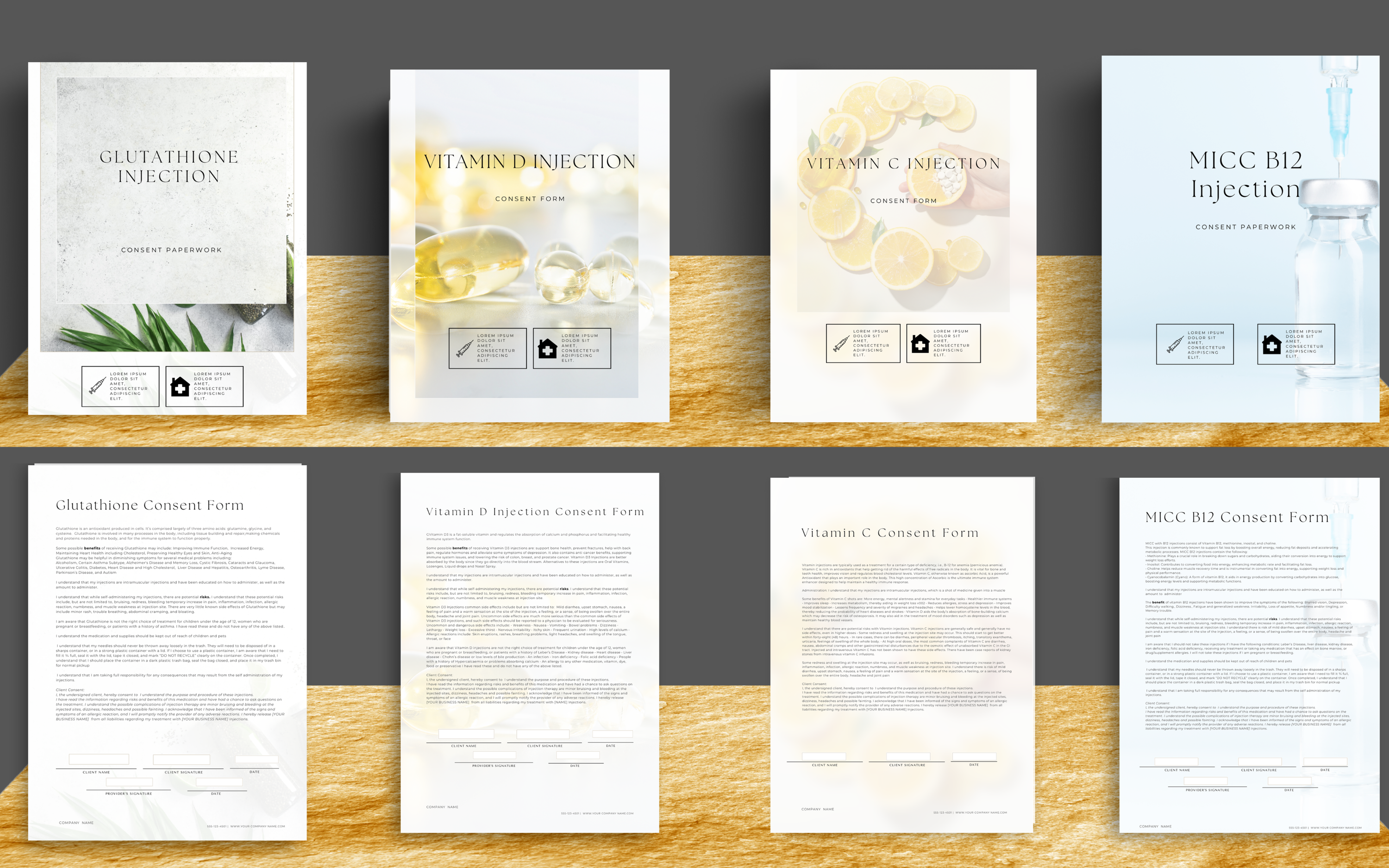 A customizable informed consent template for each type of vitamin injection treatment, designed to keep your clients informed and to ensure that your clinic is compliant with medical and legal standards.